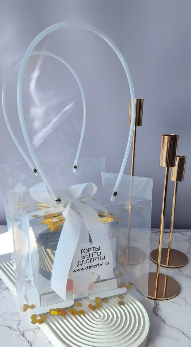 Вы можете выбрать упаковку ПРЕМИУМ - конфетти, открытка, свечка, чиркало и спичка, ваш тортик будет в прозрачной жесткой коробке на пьедестале и в прозрачном пакете с длинными ручками (доплата за упаковку 600 р.)
