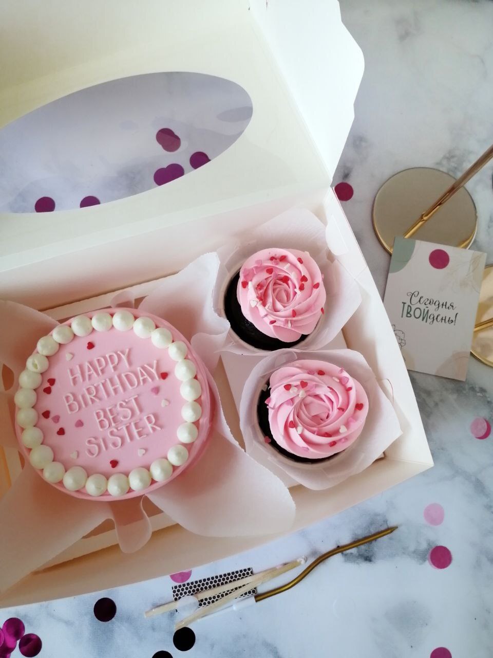 В упаковку СТАНДАРТ входит пакет, конфетти, открытка, свечка, чиркало и спичка, упаковка тортика в ланч-бокс